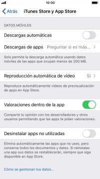 Puedes configurar el teléfono para que elimine de forma automática las apps que llevas sin utilizar mucho tiempo para poder liberar espacio en la memoria del teléfono. Todos los ajustes y los datos de las apps se guardan y se restauran cuando vuelves a instalar la app de App Store.
