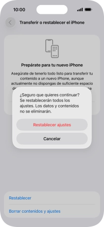 Pulsa Restablecer ajustes. Espera unos instantes mientras el teléfono restablece la configuración predeterminada. Sigue las indicaciones de la pantalla para configurar el teléfono y dejarlo listo para su uso.