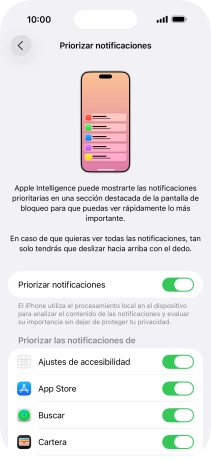 Puedes utilizar Apple Intelligence para priorizar las notificaciones más importantes y urgentes. Las notificaciones con alta prioridad aparecerán en la parte superior de la vista de notificaciones. Para poder utilizar la función, tienes que activar Apple Intelligence.