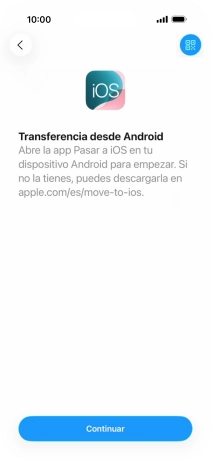 Para transferir contenido a tu teléfono, tienes que haber instalado la app "Move to iOS" (Trasladar a iOS) en el teléfono Android. Una vez se haya instalado la app, pulsa Continuar.
