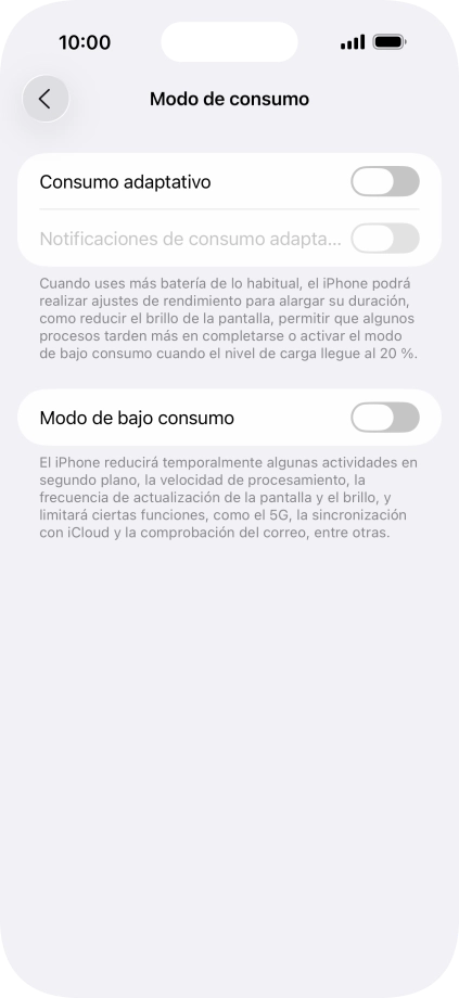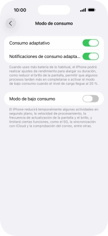 Si activas el consumo adaptativo, se utiliza Apple Intelligence para averiguar si el teléfono está usando más batería de lo normal. En ese caso, se llevarán a cabo de forma automática pequeños ajustes de brillo o de apps en ejecución para que la batería del teléfono dure más. Para poder utilizar la función, tienes que activar Apple Intelligence.