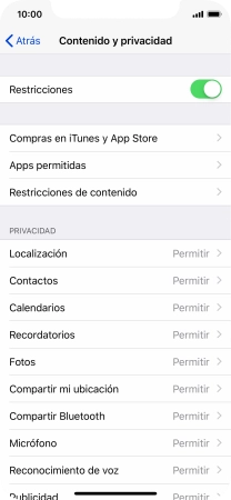 Pulsa el indicador junto a "Restricciones" y sigue las indicaciones de la pantalla para seleccionar los ajustes del contenido y de las limitaciones privadas.