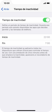 Pulsa el indicador junto a "Tiempo de inactividad" y sigue las indicaciones de la pantalla para seleccionar el período de tiempo que debe durar el tiempo de inactividad.
