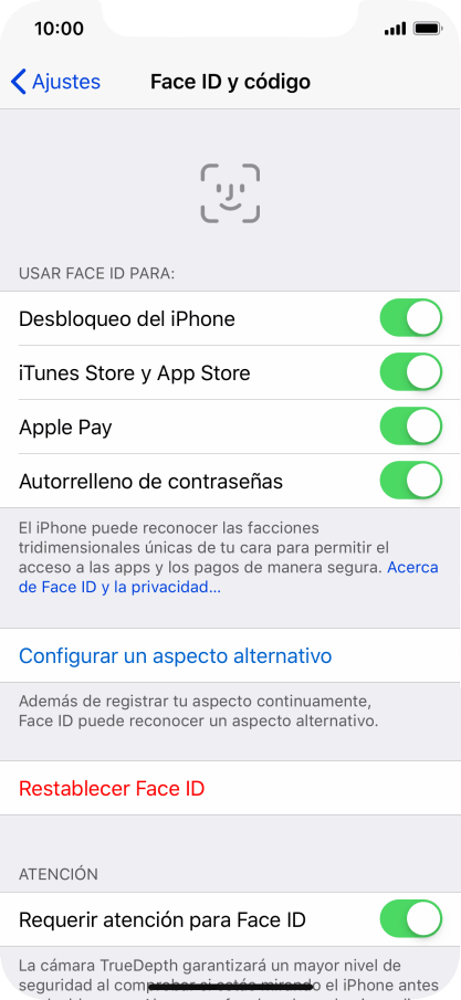 3. Selecciona los ajustes del sensor del reconocimiento facial (Face ID)