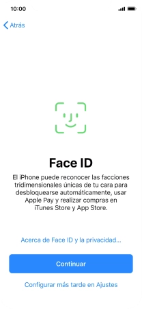 Sigue las indicaciones de la pantalla para activar el uso del reconocimiento facial (Face ID) o pulsa Configurar más tarde en Ajustes.