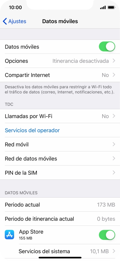 Pulsa el indicador junto a "Datos móviles" para activar o desactivar la función.