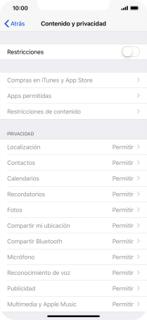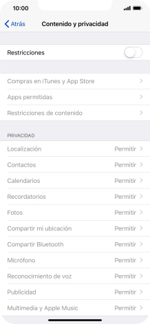Pulsa el indicador junto a "Restricciones" y sigue las indicaciones de la pantalla para seleccionar los ajustes del contenido y de las limitaciones privadas.