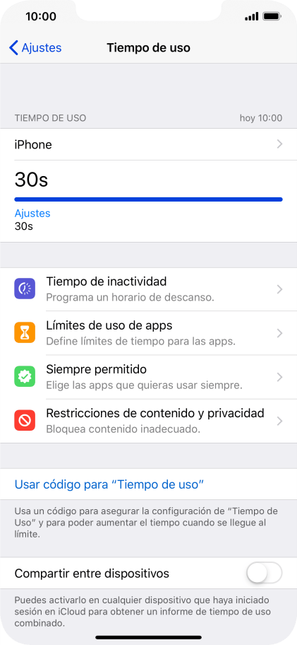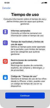Pulsa Usar código para "Tiempo de uso" y sigue las indicaciones de la pantalla para seleccionar una contraseña para la función de Tiempo de uso de pantalla.