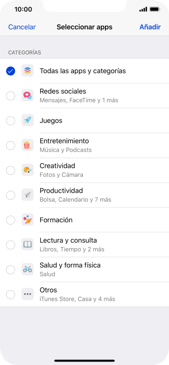 Pulsa el icono de añadir junto a la app deseada para añadirla a la lista de apps permitidas bajo el tiempo de inactividad de pantalla.