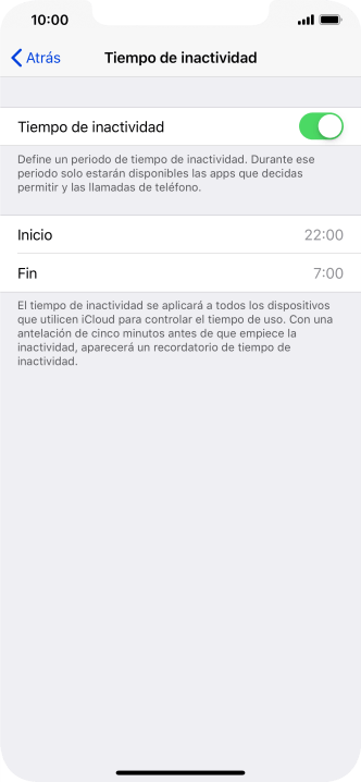 Pulsa el indicador junto a "Tiempo de inactividad" y sigue las indicaciones de la pantalla para seleccionar el período de tiempo que debe durar el tiempo de inactividad.