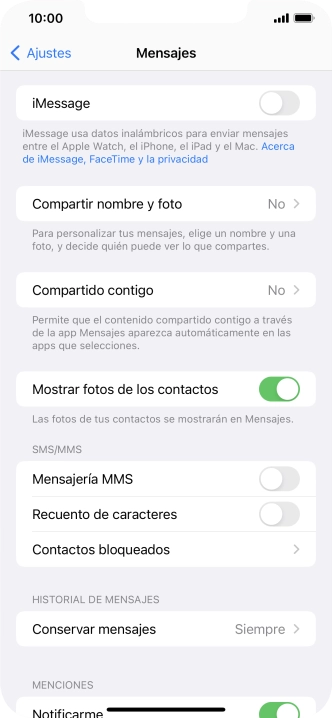 Pulsa el indicador junto a "iMessage" para activar la función.
