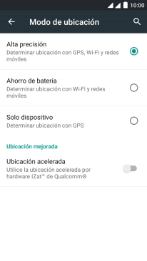 Si seleccionas Solo dispositivo, el teléfono podrá encontrar tu posición exacta con ayuda de los satélites GPS, pero le llevará más tiempo ya que no tiene acceso a informaciones complementarias de la red móvil o una red wifi cercana.