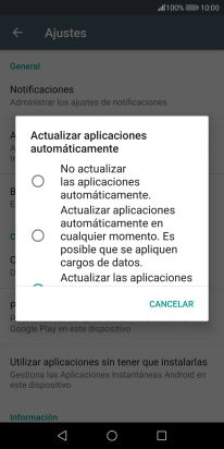 Para activar la actualización automática de apps utilizando la red móvil, pulsa Actualizar aplicaciones automáticamente en cualquier momento. Es posible que se apliquen cargos de datos..