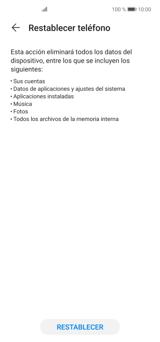 Pulsa RESTABLECER. Espera unos instantes mientras el teléfono restablece la configuración predeterminada. Sigue las indicaciones de la pantalla para configurar el teléfono y dejarlo listo para su uso.