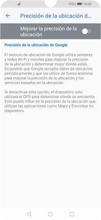 Si pulsas el indicador junto a "Mejorar la precisión de la ubicación" para desactivar la función, el teléfono podrá encontrar tu posición exacta con ayuda de los satélites GPS, pero le llevará más tiempo ya que no tiene acceso a informaciones complementarias de la red móvil o una red wifi cercana.