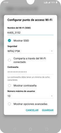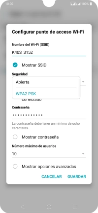 Pulsa WPA2 PSK para proteger la conexión wifi con una contraseña.