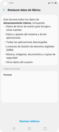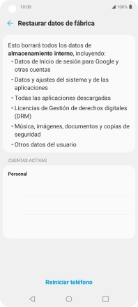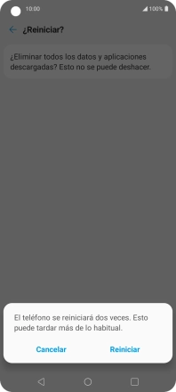 Pulsa Reiniciar. Espera unos instantes mientras el teléfono restablece la configuración predeterminada. Sigue las indicaciones de la pantalla para configurar el teléfono y dejarlo listo para su uso.