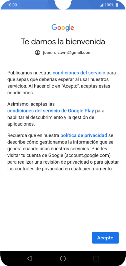 Pulsa Acepto y sigue las indicaciones de la pantalla para seleccionar los ajustes de tu cuenta de Google.
