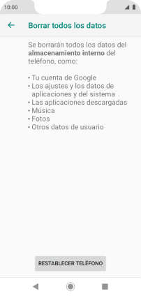 Pulsa BORRAR TODO. Espera unos instantes mientras el teléfono restablece la configuración predeterminada. Sigue las indicaciones de la pantalla para configurar el teléfono y dejarlo listo para su uso.