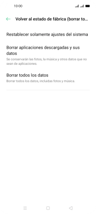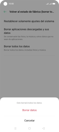 Pulsa Borrar datos. Espera unos instantes mientras el teléfono restablece la configuración predeterminada. Sigue las indicaciones de la pantalla para configurar el teléfono y dejarlo listo para su uso.