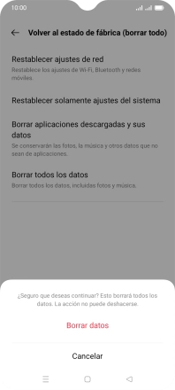 Pulsa Borrar datos. Espera unos instantes mientras el teléfono restablece la configuración predeterminada. Sigue las indicaciones de la pantalla para configurar el teléfono y dejarlo listo para su uso.
