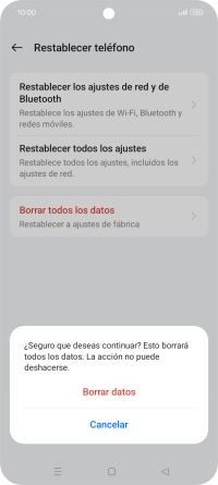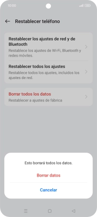 Pulsa Borrar datos. Espera unos instantes mientras el teléfono restablece la configuración predeterminada. Sigue las indicaciones de la pantalla para configurar el teléfono y dejarlo listo para su uso.