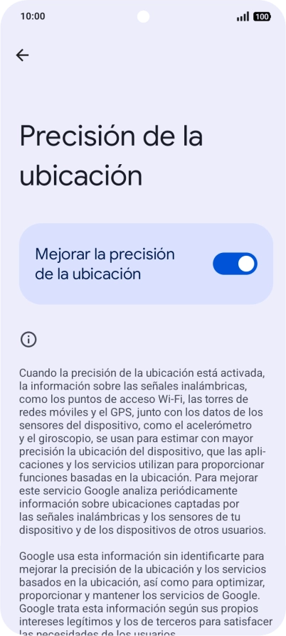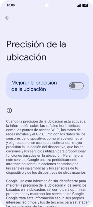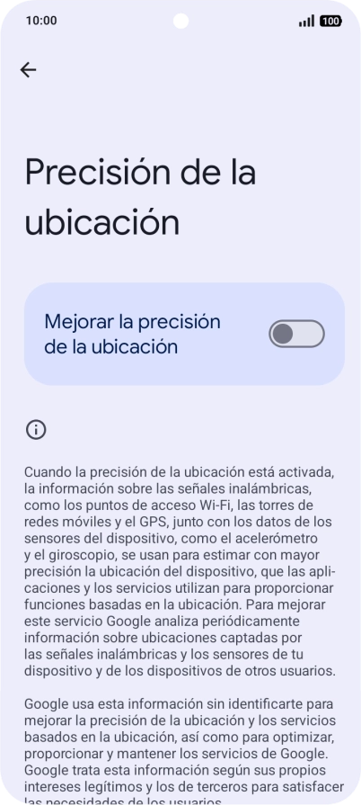Si pulsas el indicador junto a "Mejorar la precisión de la ubicación" para desactivar la función, el teléfono podrá encontrar tu posición exacta con ayuda de los satélites GPS, pero le llevará más tiempo ya que no tiene acceso a informaciones complementarias de la red móvil o una red wifi cercana.