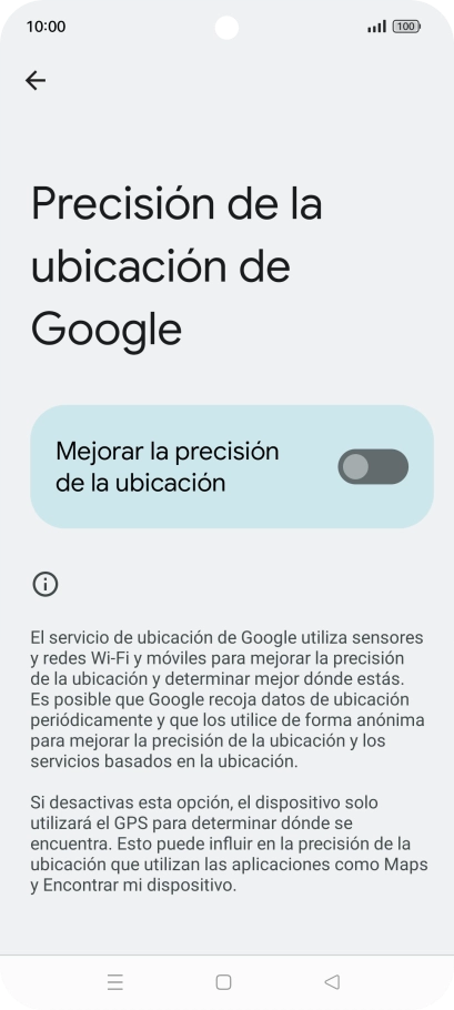 Si pulsas el indicador junto a "Mejorar la precisión de la ubicación" para desactivar la función, el teléfono podrá encontrar tu posición exacta con ayuda de los satélites GPS, pero le llevará más tiempo ya que no tiene acceso a informaciones complementarias de la red móvil o una red wifi cercana.