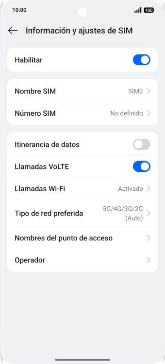 Pulsa el indicador junto a "Habilitar" para activar o desactivar el uso de la línea móvil (SIM).