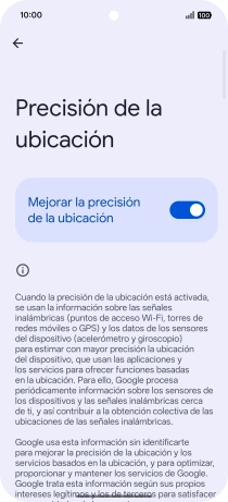 Si pulsas el indicador junto a "Mejorar la precisión de la ubicación" para desactivar la función, el teléfono podrá encontrar tu posición exacta con ayuda de los satélites GPS, pero le llevará más tiempo ya que no tiene acceso a informaciones complementarias de la red móvil o una red wifi cercana.