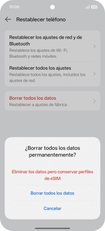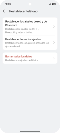 Pulsa Borrar. Espera unos instantes mientras el teléfono restablece la configuración predeterminada. Sigue las indicaciones de la pantalla para configurar el teléfono y dejarlo listo para su uso.