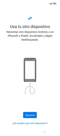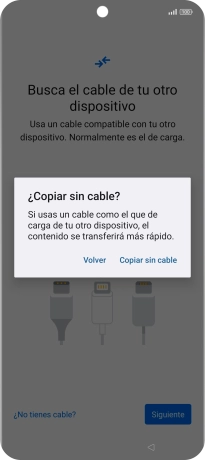 Si tienes un cable que pueda conectar ambos teléfonos, inserta el cable y sigue las instrucciones de la pantalla para transferir contenido a tu teléfono. Si no tienes un cable, pulsa ¿No tienes cable?.