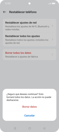 Pulsa Borrar datos. Espera unos instantes mientras el teléfono restablece la configuración predeterminada. Sigue las indicaciones de la pantalla para configurar el teléfono y dejarlo listo para su uso.