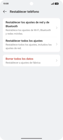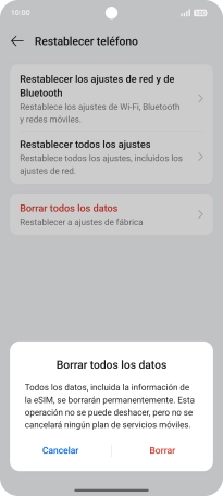 Pulsa Borrar. Espera unos instantes mientras el teléfono restablece la configuración predeterminada. Sigue las indicaciones de la pantalla para configurar el teléfono y dejarlo listo para su uso.