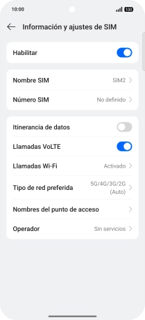 Pulsa el indicador junto a "Habilitar" para activar o desactivar el uso de la línea móvil (SIM).