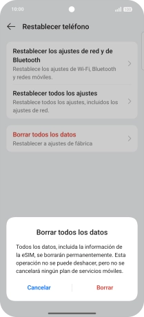Pulsa Borrar. Espera unos instantes mientras el teléfono restablece la configuración predeterminada. Sigue las indicaciones de la pantalla para configurar el teléfono y dejarlo listo para su uso.