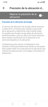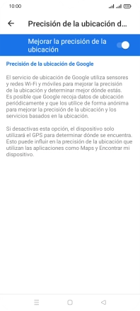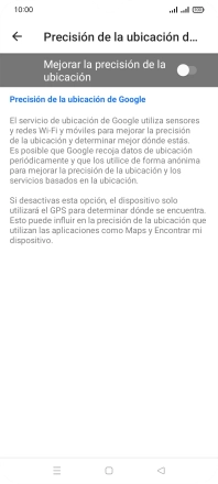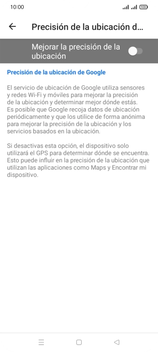 Si pulsas el indicador junto a "Mejorar la precisión de la ubicación" para desactivar la función, el teléfono podrá encontrar tu posición exacta con ayuda de los satélites GPS, pero le llevará más tiempo ya que no tiene acceso a informaciones complementarias de la red móvil o una red wifi cercana.