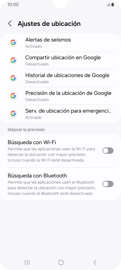 Si pulsas el indicador junto a "Mejorar la precisión de la ubicación" para desactivar la función, el teléfono podrá encontrar tu posición exacta con ayuda de los satélites GPS, pero le llevará más tiempo ya que no tiene acceso a informaciones complementarias de la red móvil o una red wifi cercana.