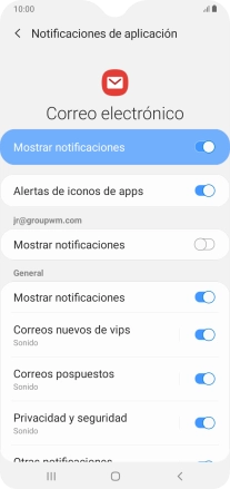 Pulsa el indicador junto a "Mostrar notificaciones" bajo la cuenta de correo electrónico deseada para activar o desactivar la función.