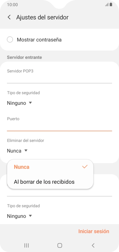 Pulsa Nunca para conservar los correos electrónicos en el servidor cuando los borras del teléfono.