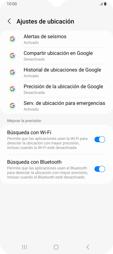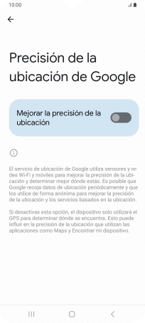 Si pulsas el indicador junto a "Mejorar la precisión de la ubicación" para desactivar la función, el teléfono podrá encontrar tu posición exacta con ayuda de los satélites GPS, pero le llevará más tiempo ya que no tiene acceso a informaciones complementarias de la red móvil o una red wifi cercana.