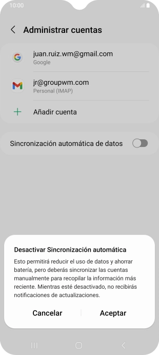 Pulsa el indicador junto a "Sincronización automática de datos" para activar o desactivar la función.