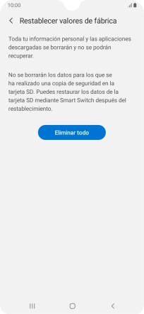 Pulsa Eliminar todo. Espera unos instantes mientras el teléfono restablece la configuración predeterminada. Sigue las indicaciones de la pantalla para configurar el teléfono y dejarlo listo para su uso.