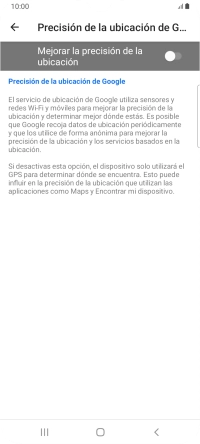Pulsa el indicador junto a "Mejorar la precisión de la ubicación" para activar la función. Si activas la función, el teléfono podrá encontrar tu posición exacta con ayuda de los satélites GPS, la red móvil y una red wifi cercana. El GPS por satélite requiere vista libre al cielo.