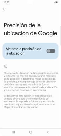 Pulsa el indicador junto a "Mejorar la precisión de la ubicación" para activar la función. Si activas la función, el teléfono podrá encontrar tu posición exacta con ayuda de los satélites GPS, la red móvil y una red wifi cercana. El GPS por satélite requiere vista libre al cielo.