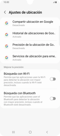 Pulsa el indicador junto a "Mejorar la precisión de la ubicación" para desactivar la función. Si desactivas la función, el teléfono podrá encontrar tu posición exacta con ayuda de los satélites GPS, pero le llevará más tiempo ya que no tiene acceso a informaciones complementarias de la red móvil o una red wifi cercana.