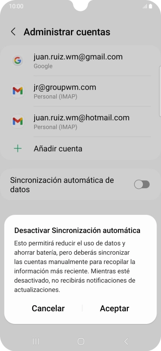 Pulsa el indicador junto a "Sincronización automática de datos" para activar o desactivar la función.