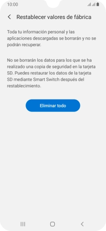 Pulsa Eliminar todo. Espera unos instantes mientras el teléfono restablece la configuración predeterminada. Sigue las indicaciones de la pantalla para configurar el teléfono y dejarlo listo para su uso.
