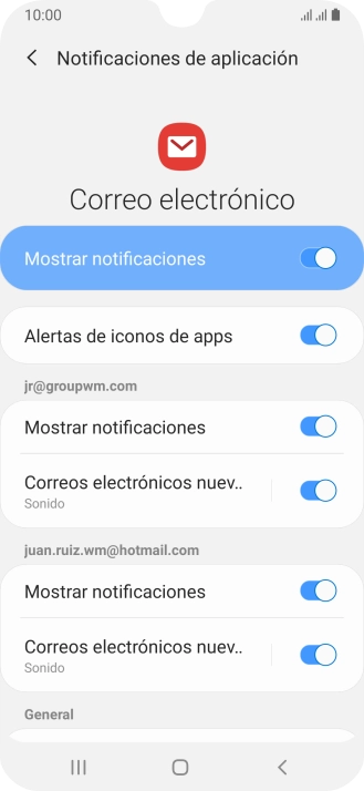 Pulsa el indicador junto a "Mostrar notificaciones" bajo la cuenta de correo electrónico deseada para activar o desactivar la función.