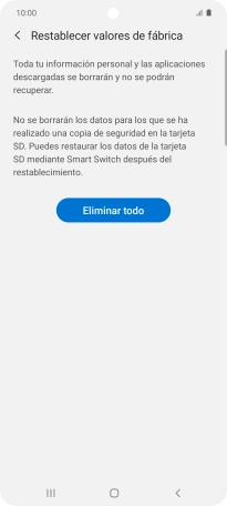 Pulsa Eliminar todo. Espera unos instantes mientras el teléfono restablece la configuración predeterminada. Sigue las indicaciones de la pantalla para configurar el teléfono y dejarlo listo para su uso.